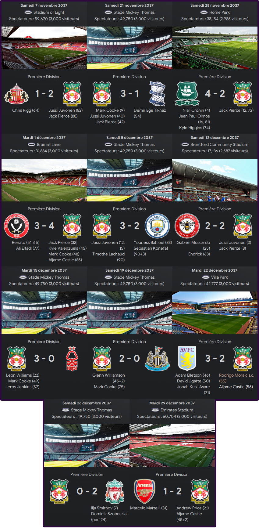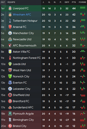 Wrexham a bien commencĂ© son mois de Novembre avec deux victoires avant une honteuse dĂ©faite 2-4 contre Plymouth, lanterne rouge du classement. Les joueurs se sont bien repris avec une sĂ©rie de cinq matchs sans dĂ©faites (quatre victoires, un nul) dont une beau succĂšs 3-2 Ă domicile contre Manchester City. Sâensuit deux dĂ©faites de rang, dont un 0-2 Ă domicile contre Liverpool un rival dans la course au titre avant de terminer lâannĂ©e 2037 par une belle victoire 2-1 sur la pelouse dâArsenal.