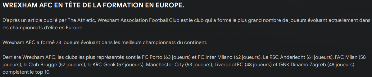 Le football europĂ©en vient une nouvelle fois de rendre son verdict en matiĂšre de formation. Selon le classement annuel publiĂ© par The Atlantic, le Wrexham AFC conserve, pour la sixiĂšme annĂ©e consĂ©cutive, sa place de numĂ©ro un des clubs ayant formĂ© le plus grand nombre de joueurs Ă©voluant dans les championnats dâĂ©lite du Vieux Continent. Avec 73 joueurs issus de son acadĂ©mie actuellement prĂ©sents dans les ligues majeures europĂ©ennes, le club gallois confirme son statut de rĂ©fĂ©rence absolue dans le domaine.