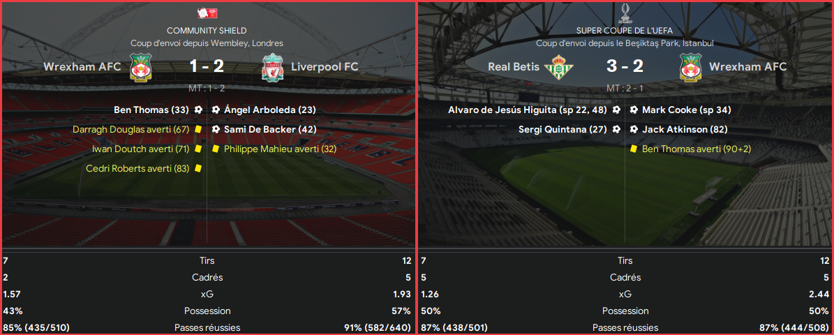 Le premier match officiel de la saison, câĂ©tait le Communityâs Shield, face Ă Liverpool. Premier test avec une cadence Premier League et une intensitĂ© maximum. MalgrĂ© une vraie rĂ©sistance, un bloc compact, et quelques sorties de balle parfaitement travaillĂ©es, Wrexham sâest inclinĂ© 1-2. La premiĂšre dĂ©faite depuis deux ans. Toutes compĂ©titions confondues. Un symbole, mais aussi un marqueur : le cycle prĂ©cĂ©dent est bel et bien clos.